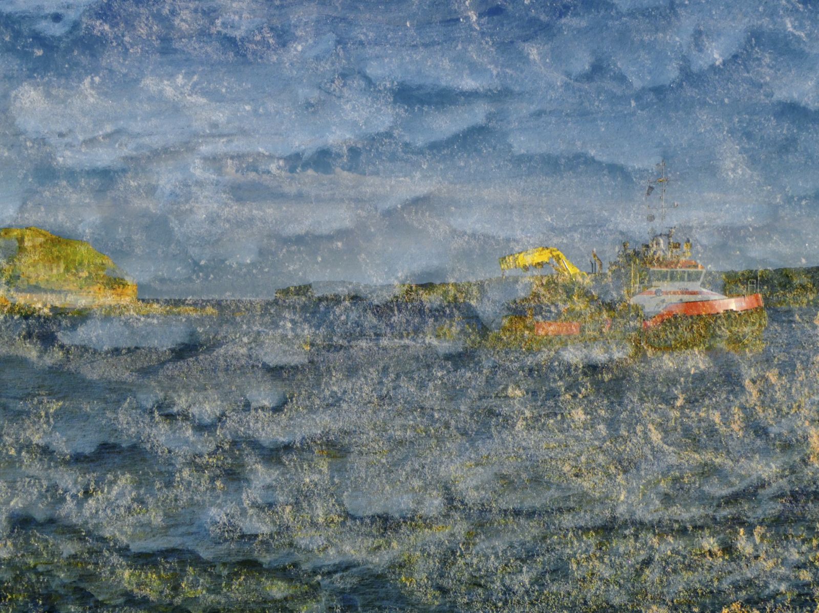 Dredges and tugs have been working in Botany Bay as part of laying an electricity cable under the entrance to Botany Bay. The dredge often work late and provides some interesting evening pictures. The pictures are all multiple exposures allowing me to overlay some of the wonderful rock textures on the working boats.